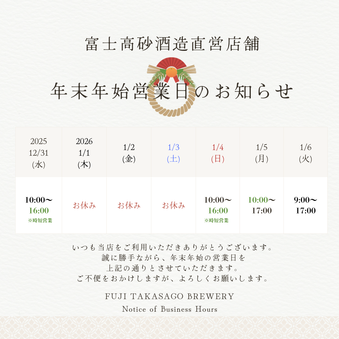 いつも富士高砂酒造蔵直営店舗をご利用いただきまして誠にありがとうございます。